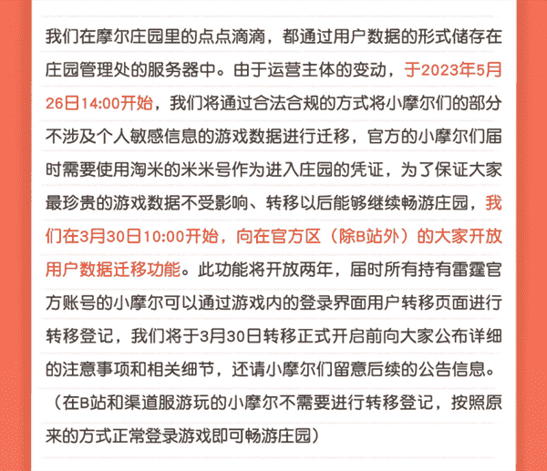 合作结束本就是开发方和代理方双方的事情,,,降低这件事情对玩家的影响,,才是对所有珍视这段童年的摩尔玩家最好的呵护。。。目前看来,,,,用户完全不用担心后续因无法登录游戏而造成任何数据上的损失,,,,只要及时进行账号转移,,,就可以好好保留、、、延续在庄园的痕迹和回忆,,,继续在庄园里做快乐的红鼻子小鼹鼠。。
