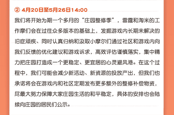 合作的结束并不意味着这个童年IP的结束,,,对于《摩尔庄园》手游而言,,,,这是一个新阶段的开始。。。后续游戏内将开启庄园重构计划,,会就以往遗留下来的BUG进行集中修复,,并在游戏内和社区定期发布更多补偿物资。。。